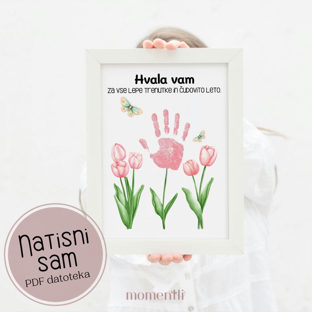 S to digitalno predlogo lahko ustvariš unikatno darilo za vzgojiteljico, učiteljico. Po nakupu prejmeš 1 PDF datoteko v A4 formatu, ki jo preprosto natisneš doma ali v tiskarni. Nato dodaš otroški odtis dlani ali prstni odtis, s katerim preprosta ilustracija dobi poseben pomen. To je trajen spomin na tiste drobne rokice, ki rastejo prehitro.