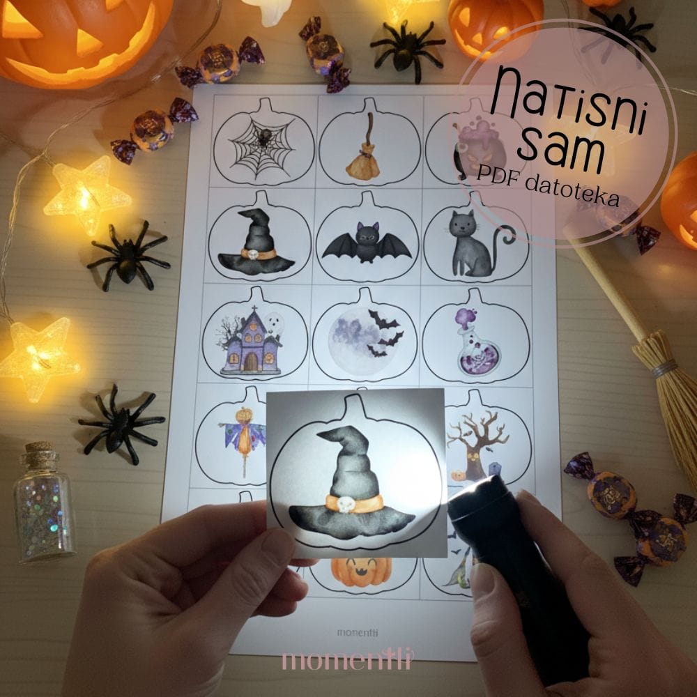 Zabavna in ustvarjalna dejavnost za otroke, pri kateri se s pomočjo svetlobe skrivnostne Halloween sličice kar naenkrat prikažejo. Otroci raziskujejo, odkrivajo in ob tem krepijo svojo domišljijo, opazovanje ter natančnost. Ko svetloba zasije skozi papir, se motivi prikažejo kot pri čarovniji!